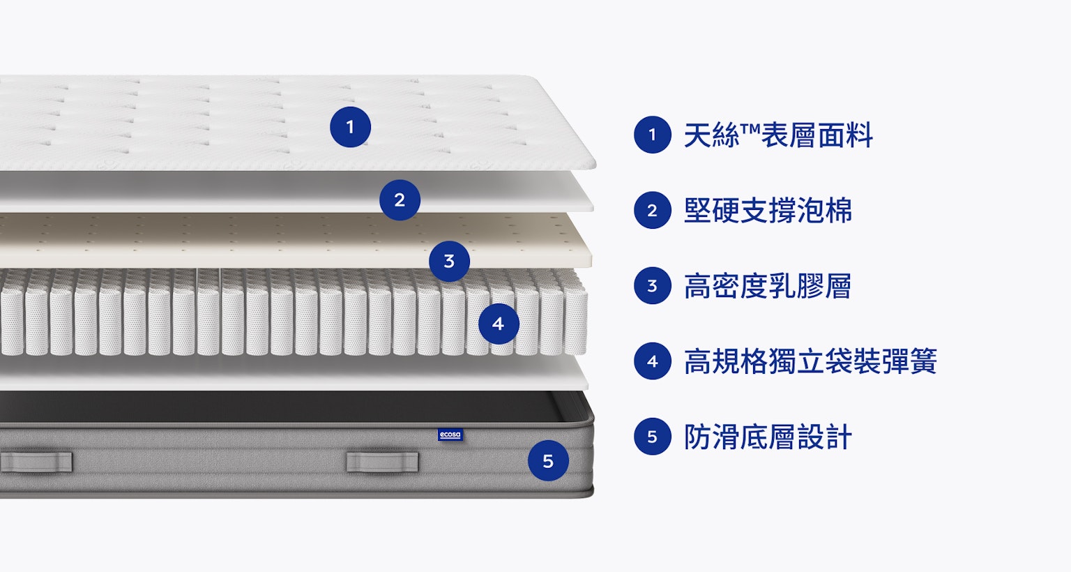 - 床褥表面面料採用23%回收聚酯纖維(來自塑膠瓶)與環保 Tencel™ 面料,柔軟透氣又達到地球永續。