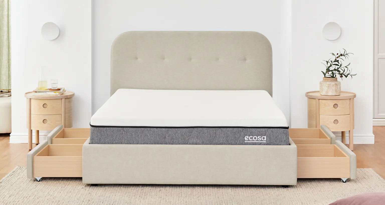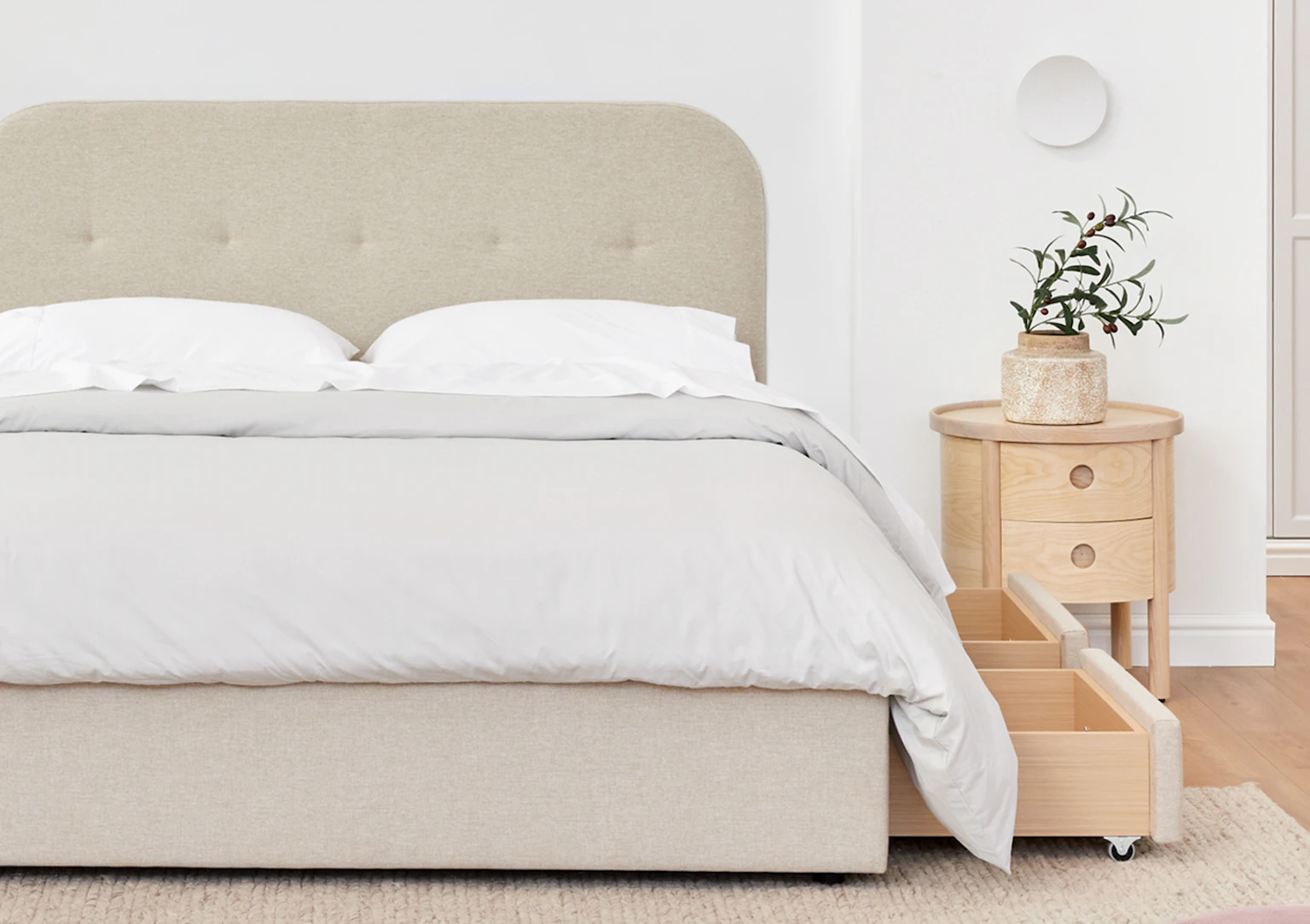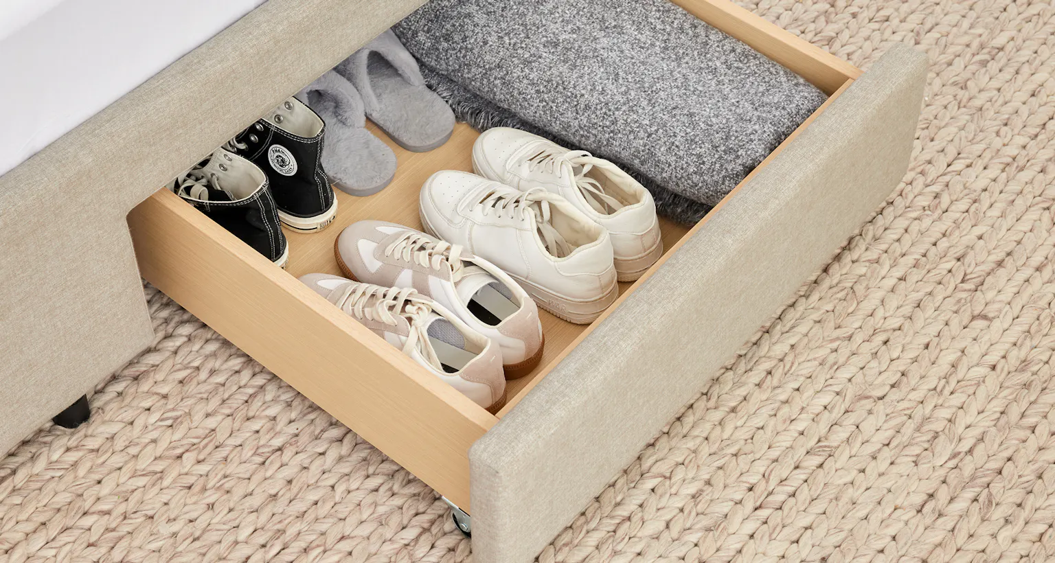 善用床下空間,Cove 儲物床架設有兩個大容量抽屜,輕鬆收納備用枕頭、被褥及床品,有效提升居家收納效率。